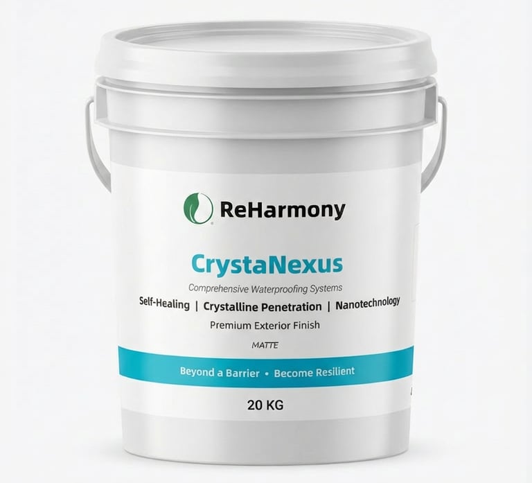 ReHarmony CrystaNexus® is a revolutionary two-component penetrating crystalline waterproofing system developed with cutting-edge inorganic nanotechnology. Through the synergistic reaction of its A and B components, it deeply penetrates the concrete substrate to grow insoluble, dendritic crystalline structures that become an integral part of the structure itself. This process builds a durable, breathable waterproof barrier from within.